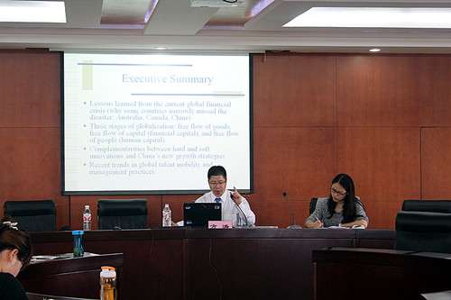 首先,方涛教授对中国改革开放35年来的市场的巨大变革进行了讲解。他指出目前我国中小企业发展的瓶颈主要是融资困难、技术人才匮乏、政府支持力度不够。方教授由浅入深,紧接着全面解析了全球金融危机中中国、加拿大、澳大利亚等国家基本没有受经济危机影响的原因。指出中国是全球化最大的赢家,但中国现阶段仍是以低工资、低成本在国际市场上竞争,同时缺乏有国际视野的管理人才。演讲过程中,方博士以苹果公司的高科技产品分析为起点,逐层分析了“中国制造”的优势所在,简析了中小企业以“科技创新,制度创新”为基础的发展战略以及今后十年中国经济发展的新出路。