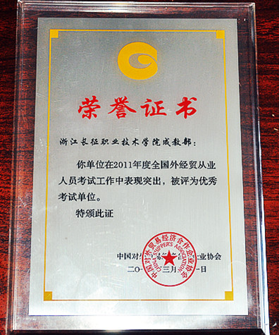 由于在2011年度全国外经贸从业人员考试工作中表现突出,学院被中国对外贸易经济合作企业协会评为优秀考试单位。