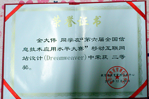 第六届全国信息技术应用水平大赛决赛于12月18日在北京科技大学举行。在院领导的大力支持和关怀下,我院参赛学生金大伟同学于12月17日顺利到达北京,参加全国总决赛。12月18日9:00-14:00,经过6个小时的角逐,我院计算机与信息技术系09软件班的金大伟同学获得“移动互联网站设计”组二等奖的好成绩,同时指导老师袁芬获本次大赛最佳指导老师荣誉称号。