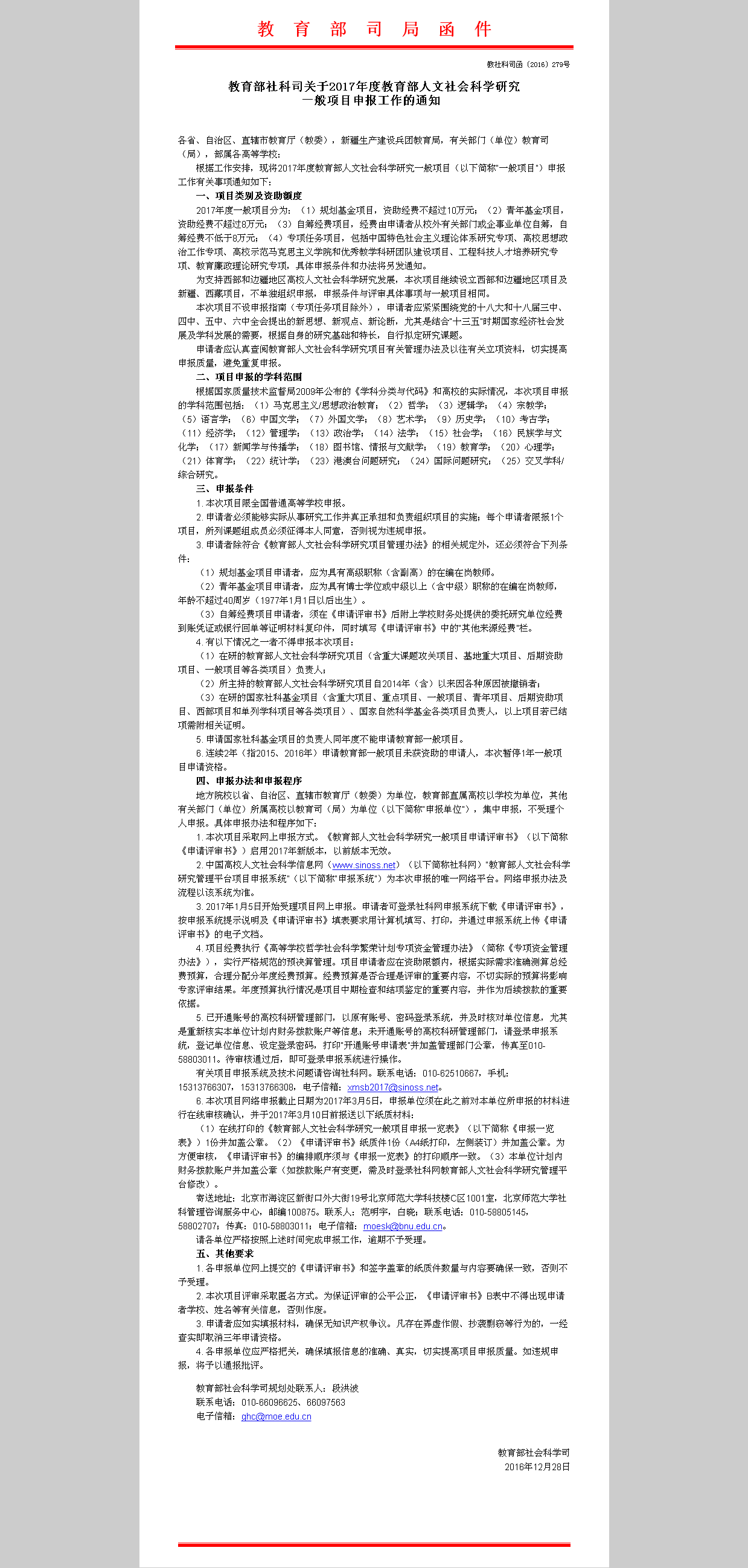 1、教育部社科司关于2017年度教育部人文社会科学研究一般项目申报工作的通知