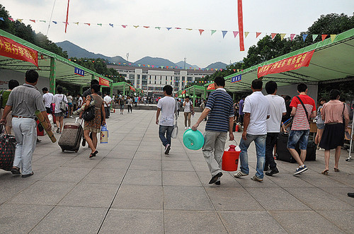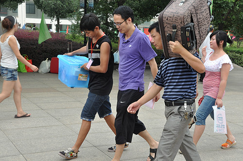 在学院图书馆和体育馆前广场上,新生报到处、咨询处,区域划分明确,标牌提示醒目,令人一目了然。在工作人员的相互配合、共同努力下,各区域工作进展有条不紊,在志愿者的协助下,各工作台前排起一条条整齐的队伍,秩序井然有序。新生在志愿者的帮助下,按照报到流程,迅速办理入学手续,领取生活用品。学生处和招生就业指导处专门设置了绿色通道,为新生和家长答疑解惑。同时,学校由教师和学生志愿者组成的迎新队在各火车站和汽车站都设立了校外迎新接待站,派出数十辆校车循环前往各站点迎接新生的到来。