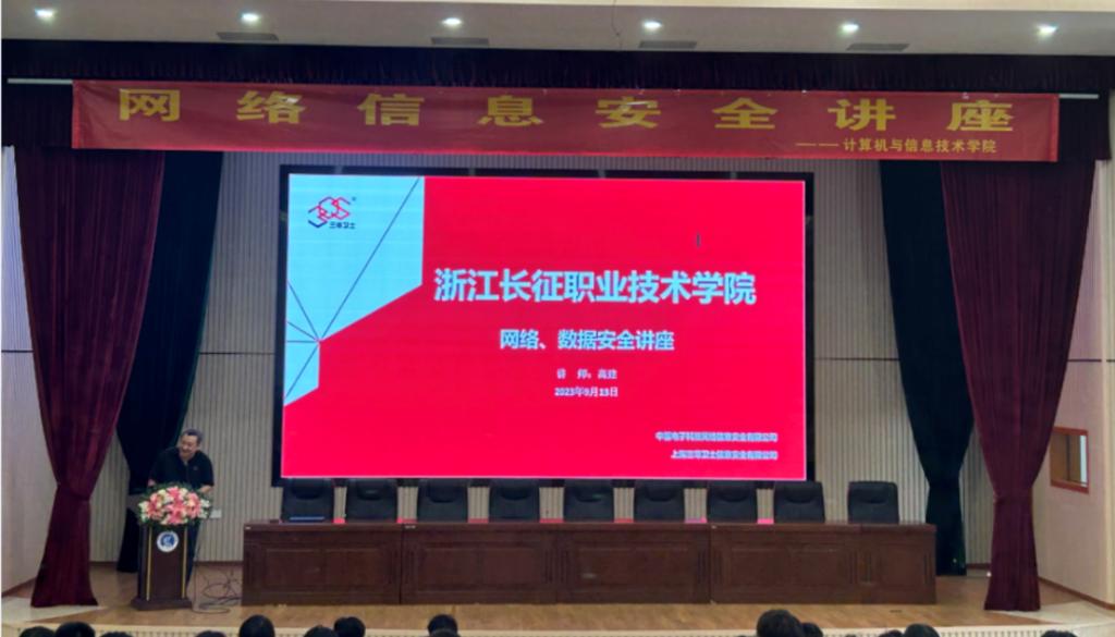 学校邀请了中国电子科技网络信息安全有限公司上海三零卫士信息安全有限公司杭州分公司副总经理高建,在学校第二报告厅为师生代表开展了网络安全专题讲座。高建在讲座中着重指出了当前网络环境下的风险和挑战,并分享了一些实用的提升网络安全技术和安全意识的方法。讲座受到了师生们的热烈欢迎。
