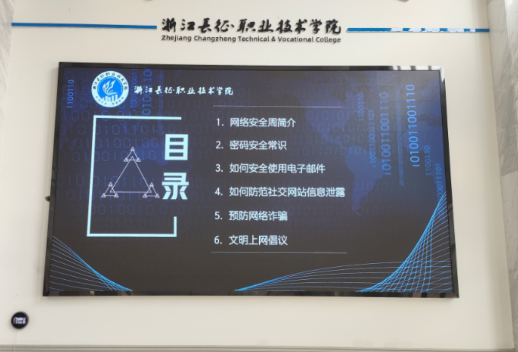 活动期间各单位紧密联动,通过悬挂宣传标语、摆放宣传展板,电子屏滚动显示网络安全宣传内容,开展主题班会,专题讲座等形式形成了师生“共筑网络安全防线,同守网络清朗家园”的浓厚氛围。