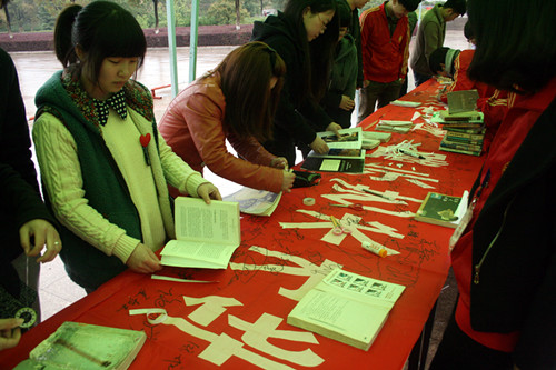 开幕式现场举行文明修书、横幅签名活动,吸引不少同学参与其中。在修补过程中,同学们熟练的运用剪刀,双面胶等工具对图书进行修补,短短几分钟就给原本有些残破的图书换了新貌。此次活动让同学们意识到保护书籍,重要的不在于修补,而是在于借阅时的爱护,不对书本乱涂乱画,不随处乱放书本,文明用书。此外,同学们还积极响应“文明修书”的号召,踊跃在横幅上签名,以示支持。